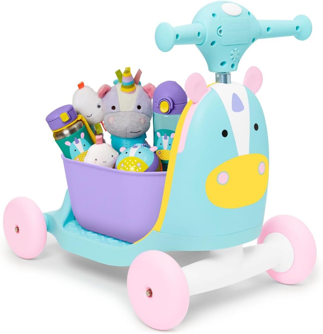 Designed to grow with your little one for three stages of fun, Skip Hop’s cute and colorful Ride-On Toy offers an entertaining way to encourage motor skills development, balance and coordination at playtime. Stage one, designed for early walkers, motivates little ones to push and pull in wagon mode—a great spot for favorite toys, too. At stage two, the wagon’s storage tub converts to a seat for ride-on mode. Ready for stage three? Just remove the seat, pull up the adjustable handle for your toddler, hop on the scooter and take it for a spin! They’ll love pressing the button at the front for lights, beeping sounds and more fun sound effects as they whizz along.